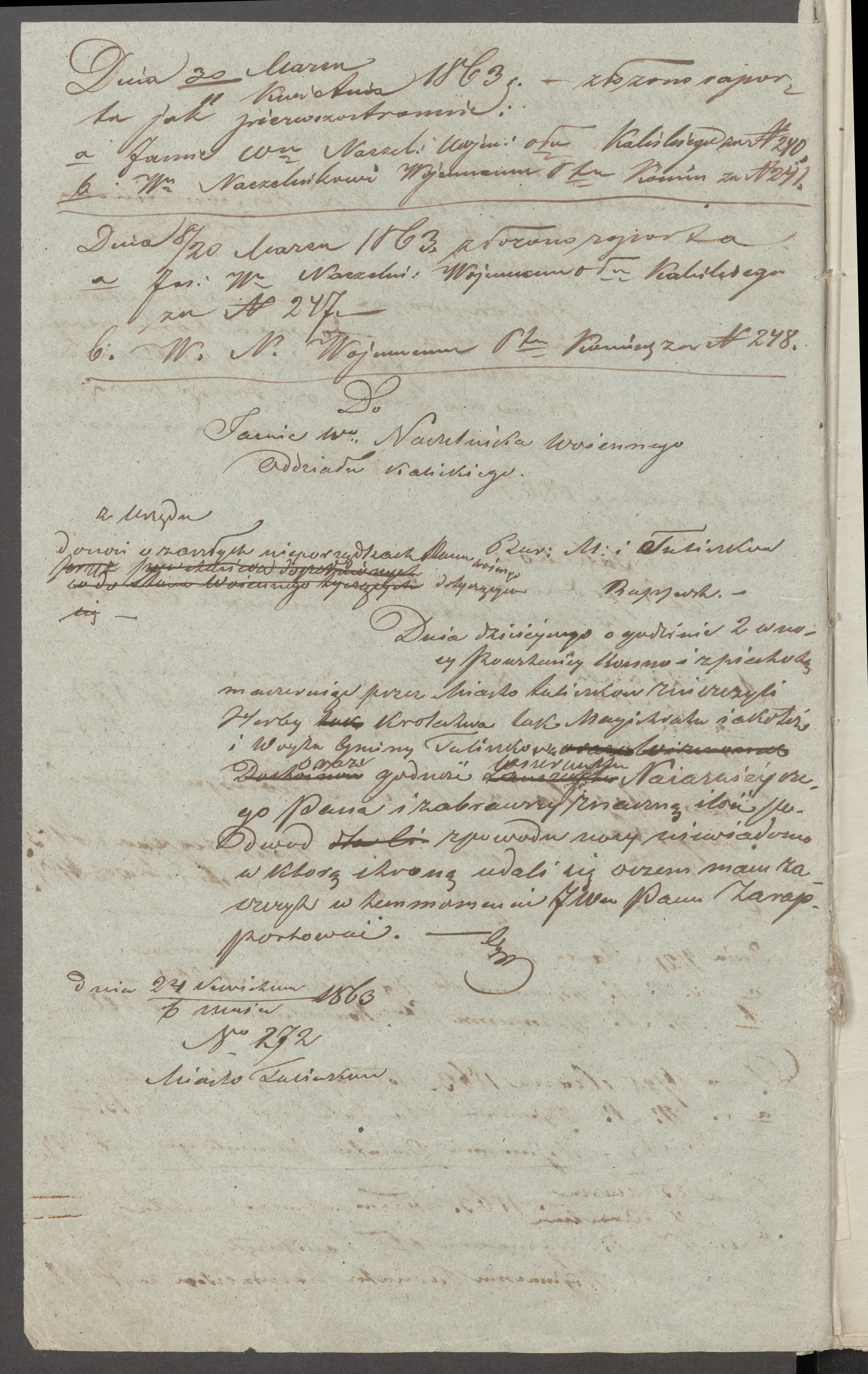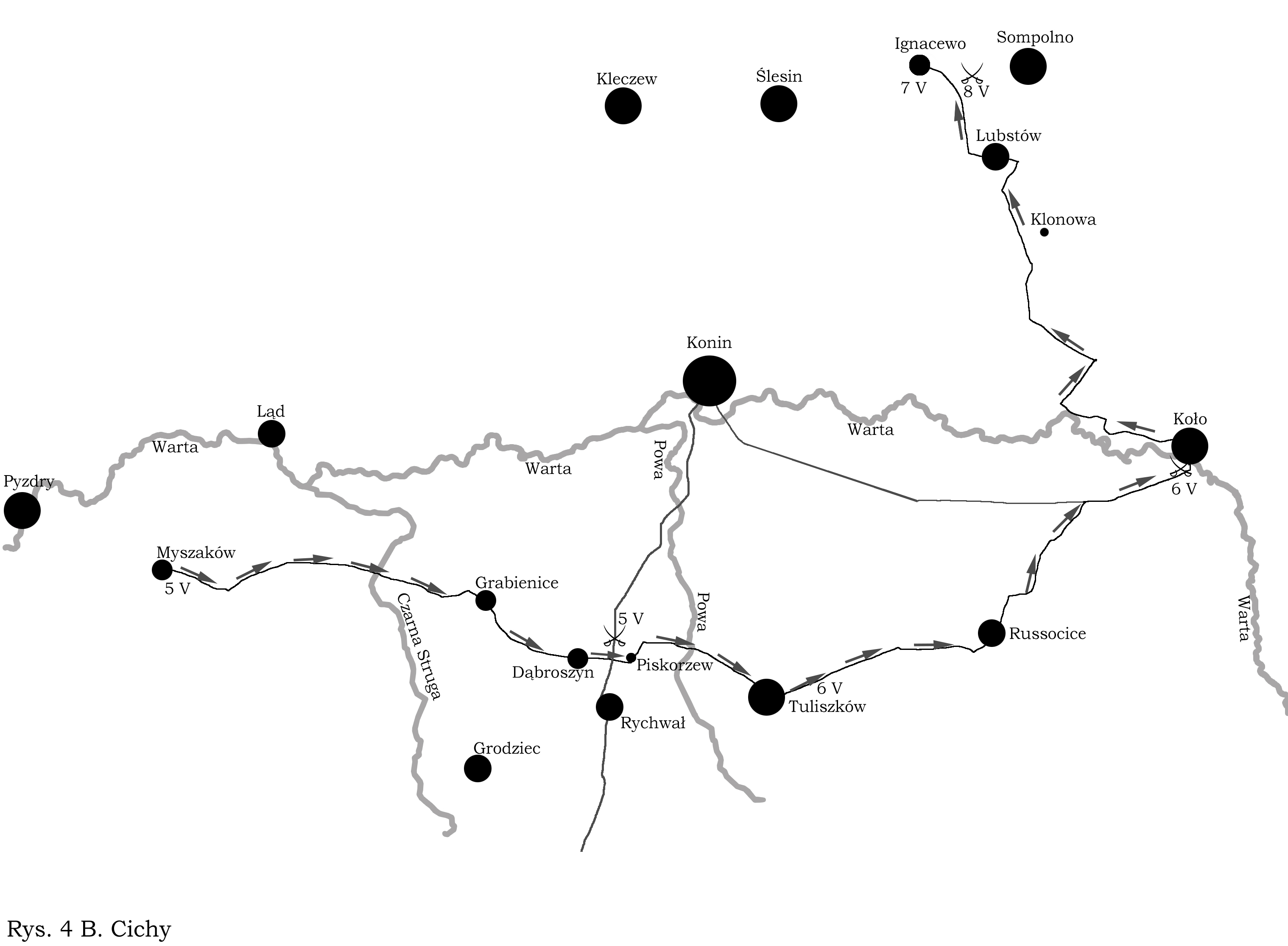 POTYCZKA POD PISKORZEWEM 5 MAJA 1863 R. I PRZEMARSZ ODDZIAŁU EDMUNDA TACZANOWSKIEGO PRZEZ TULISZKÓW I KOŁO DO IGNACEWA.STRESZCZENIEWSTĘPDotychczas nie wiadomo gdzie znajdowali się powstańcy Edmunda Taczanowskiego, gdy zaatakowali pododdział Andrieja Brunnera na drodze Rychwał - Konin. Według jednych było to pod Dąbroszynem (1), według innych pod Rychwałem (2). Wątpliwości budzi również data i przebieg tego zdarzenia. Nie wykazano, czy po potyczce E. Taczanowski zawrócił do Myszakowa (3), czy przez Tuliszków poszedł dalej do Koła (4). CELCelem tej pracy jest ustalić miejscowość, z której wyszedł atak jazdy E. Taczanowskiego na pododdział rosyjski znajdujący się na drodze Rychwał - Konin, właściwą datę potyczki oraz dalszą trasę marszu powstańców. MATEIAŁY I METODYPrzeanalizowano publikacje odnoszące się do potyczki określanej jako potyczka pod Dąbroszynem lub pod Rychwałem. Informacje zawarte w publikacjach porównano: z dokumentami w archiwach, doniesieniami prasowymi z okresu powstania styczniowego i mapami. Dokonano wizji w terenie. WYNIKI I DYSKUSJAW opublikowanych materiałach istnieją sprzeczne dane odnośnie: miejscowości, przebiegu i daty potyczki, oddziału z którym walczono, liczb zabitych i wziętych do niewoli Rosjan, dalszego kierunku marszu powstańców. Ustalono, że oddział E. Taczanowskiego wieczorem 5 maja 1863 r. podczas spotkania z pododdziałem rosyjskim znajdował się w Piskorzewie odległym 3 km od Dąbroszyna i 3,2 km od Rychwała. Po pokonaniu konnych strażników pogranicznych należących do oddziału A. Brunnera E. Taczanowski przybył do Tuliszkowa, skąd przed świtem 6 maja udał się do Koła, a stamtąd do Ignacewa. Nie ma związku pomiędzy miejscami pamięci w Grabowej w gminie Rychwał a omawianą potyczką. WNIOSKIAtak jazdy E. Taczanowskiego 5 maja 1863 roku na pododdział rosyjski na drodze Rychwał - Konin wyszedł z Piskorzewa. Powstańcy zmierzali z Myszakowa przez Tuliszków i Koło do Ignacewa. SŁOWA KLUCZOWEBrunner, Dąbroszyn, Grabowa, Koło, Ignacew, Piskorzew, Powstanie Styczniowe, Taczanowski, Tuliszków, Rychwał. Skirmish at Piskorzew on 5 May 1863 and the March of Edmund Taczanowski Unit Through Tuliszków and Koło to Ignacew.AbstractBackgroundIt is not known at exactly what location along the road between Rychwał and Konin the insurgent forces led by Edmund Taczanowski attacked Gen. Andriej Brunner’s subdivision. According to some, it was near Dąbroszyn (1); according to others, near Rychwał (2). The date and course of events are also open to question. It has not been shown whether after the skirmish, Taczanowski retreated back to Myszaków (3), or whether he advanced via Tuliszków to Koło (4). ObjectiveThe aim of this work is to establish the place along the road from Rychwał to Konin from which Taczanowski’s forces carried out a cavalry charge on the Russian subdivision, the correct date of the skirmish, and the route of the insurgents’ subsequent march. Materials and MethodsPublications were analysed relating to the skirmish, commonly referred to as the Skirmish at Dąbroszyn or Skirmish at Rychwał. The information contained in these materials was compared with archival documents, maps, and press reports from the time of the January Uprising. A field inspection was also carried out. Results and discussionThere are contradictory data in the published materials regarding the town where the fighting took place, the course and date of the skirmish, the Russian units involved, the numbers of Russians killed and taken prisoner, and the further direction of the insurgents' march. During the research, It was established that on the evening of 5 May 1863, Taczanowski’s unit encountered the Russian subdivision in Piskorzew, 3 km from Dąbroszyn and 3.2 km from Rychwał. After defeating the mounted border guards that were part of Brunner's unit, Taczanowski arrived in Tuliszków, from where he travelled to Koło before dawn on 6 May, and from there to Ignacewo. There is thus no connection between the memorial at Grabowa in the municipality of Rychwał and the skirmish in question. ConclusionsTaczanowski’s cavalry charge on 5 May 1863 against the Russian subdivision on the road between Rychwał and Konin began at Piskorzew. Afterwards, the insurgents moved away from Myszaków and headed via Tuliszków and Koło towards Ignacew. Keywords:Brunner, Dąbroszyn, Grabowa, Koło, Ignacew, Piskorzew, January Uprising, Taczanowski, Tuliszków, Rychwał. WSTĘPOddział Edmunda Taczanowskiego idąc z Myszakowa do Ignacewa stoczył po drodze potyczkę umiejscawianą według jednych pod Dąbroszynem (1), według innych pod Rychwałem (2). Dotychczas nie określono gdzie dokładnie znajdowali się powstańcy, gdy doszło do potyczki. Istnieją sugestie, że zachodzi związek miedzy tą potyczką a miejscem pamięci w Grabowej w gminie Rychwał (5). Wątpliwości budzi również data potyczki. Józef Białynia–Chołodecki w swoim wykazie bitew, walk, starć i potyczek wymienił Dąbroszyn nie podając daty potyczki (6), a starciu pod Rychwałem przypisał datę 30 kwietnia (7). Stanisław Zieliński w spisie chronologicznym potyczkę pod Dąbroszynem umieścił pod datą 3 maja 1863 r. (8). Sprzeczne informacje dotyczą też trasy dalszego marszu powstańców. Teodor Żychliński uznał, że oddział Taczanowskiego spod Dąbroszyna wrócił do Myszakowa (9). Natomiast według Hipolita Gliszczyńskiego powstańcy zmierzali dalej do Koła (10). CELCelem tej pracy jest ustalenie miejsca, z którego wyszedł atak jazdy E. Taczanowskiego na pododdział rosyjski znajdujący się na drodze Rychwał - Konin, właściwej daty potyczki oraz dalszej trasy marszu powstańców. MATERIAŁY I METODYNa podstawie bibliografii wykonano przegląd i analizę istniejących publikacji odnoszących się do potyczki określanej jako potyczka pod Dąbroszynem lub pod Rychwałem. Informacje zawarte w publikacjach po
